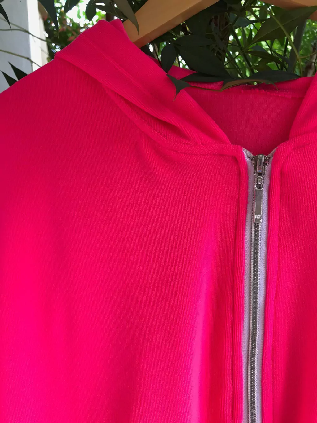 JAQUETA ATOALHADA ROSA PINK ESTILO CROPPED COM ZÍPER FRONTAL, BOLSOS E CAPUZ